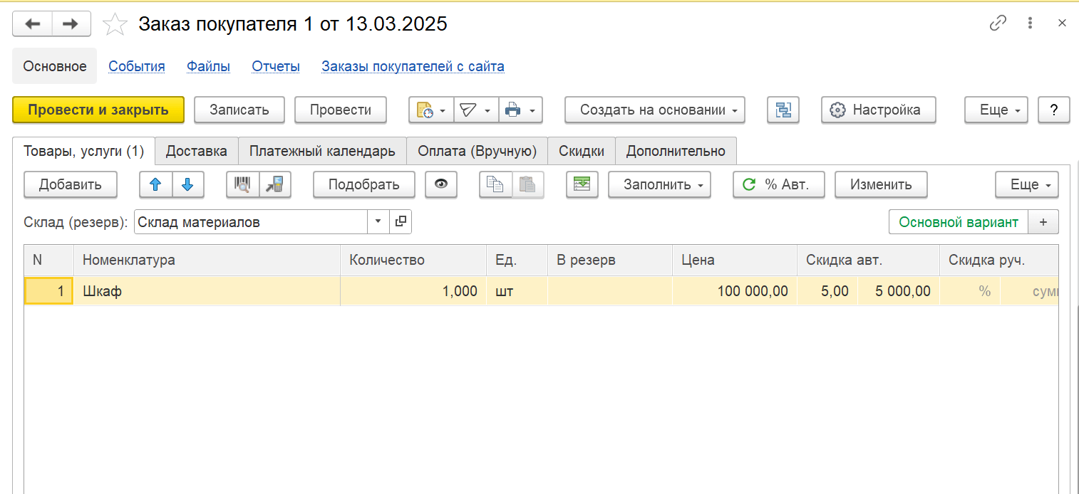 Разберем позаказное производство на примере производства шкафа. Введем заказ покупателя на шкаф и запланируем его производство.
