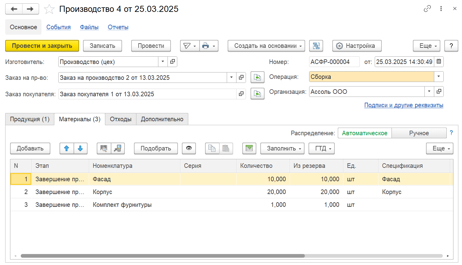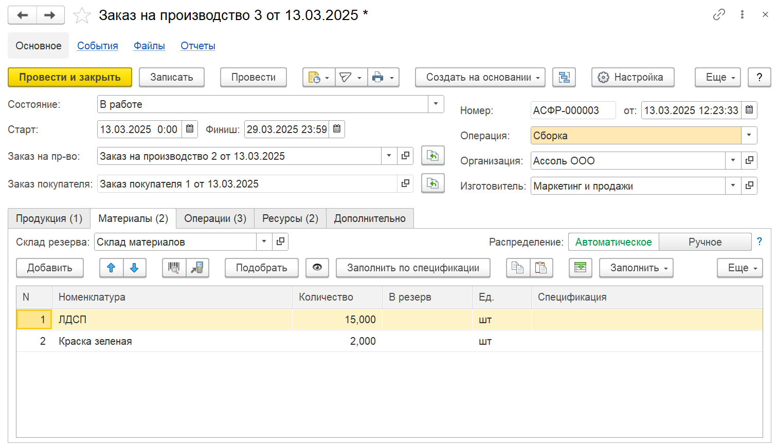 При заполнении документа «Производство» обратите внимание, что материалы вы должны заполнить из резерва. Таким образом, для производства конечного изделия будут использованы те материалы и полуфабрикаты, которые зарезервированы для него в документе «Заказ на производство». Поле «Заказ покупателя» должно быть заполнено.