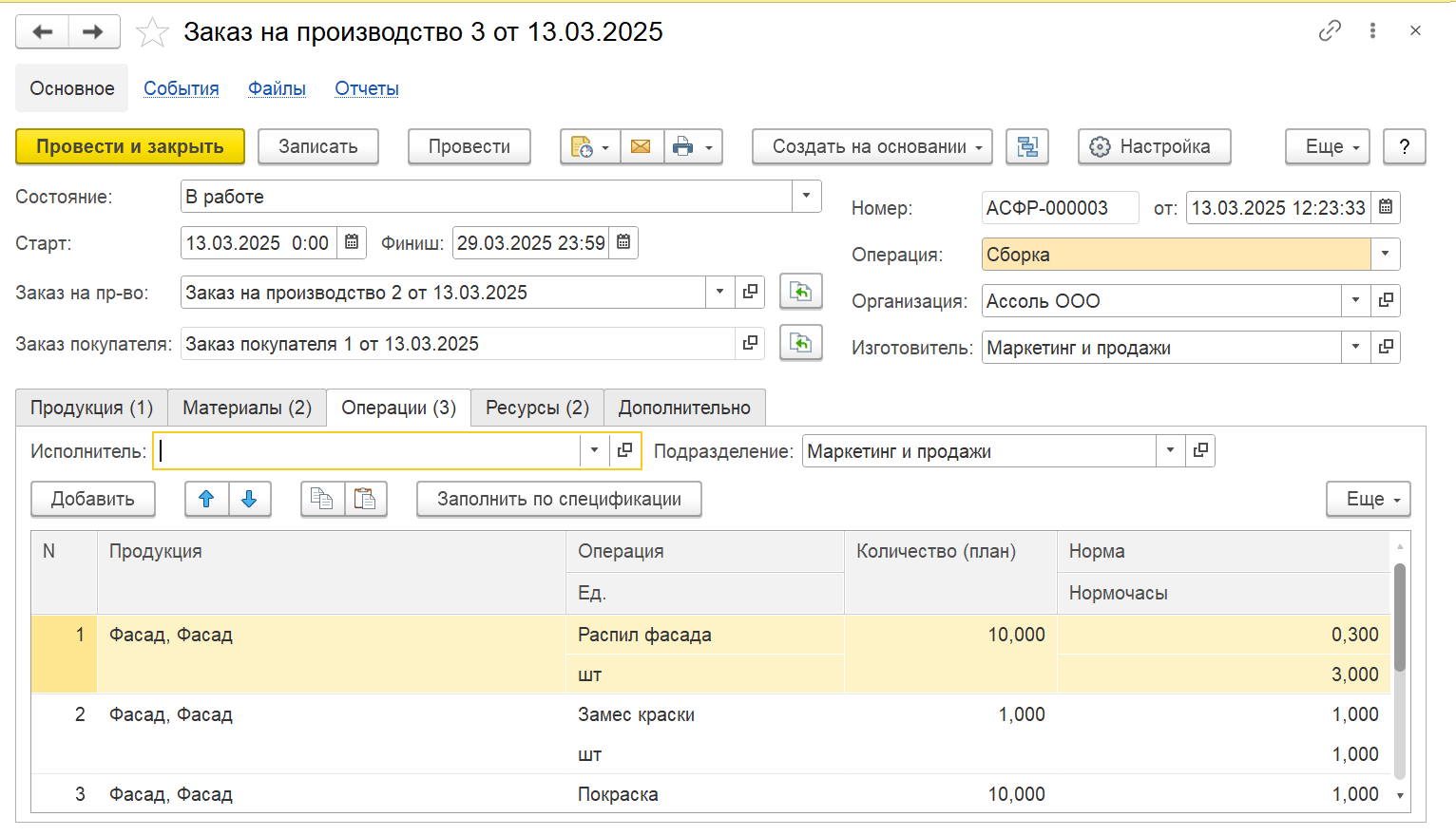 Таким образом, создалась цепочка заказов на производство на 2 вида полуфабрикатов, которые у нас здесь есть: фасад и корпус.Ввод фактического производства