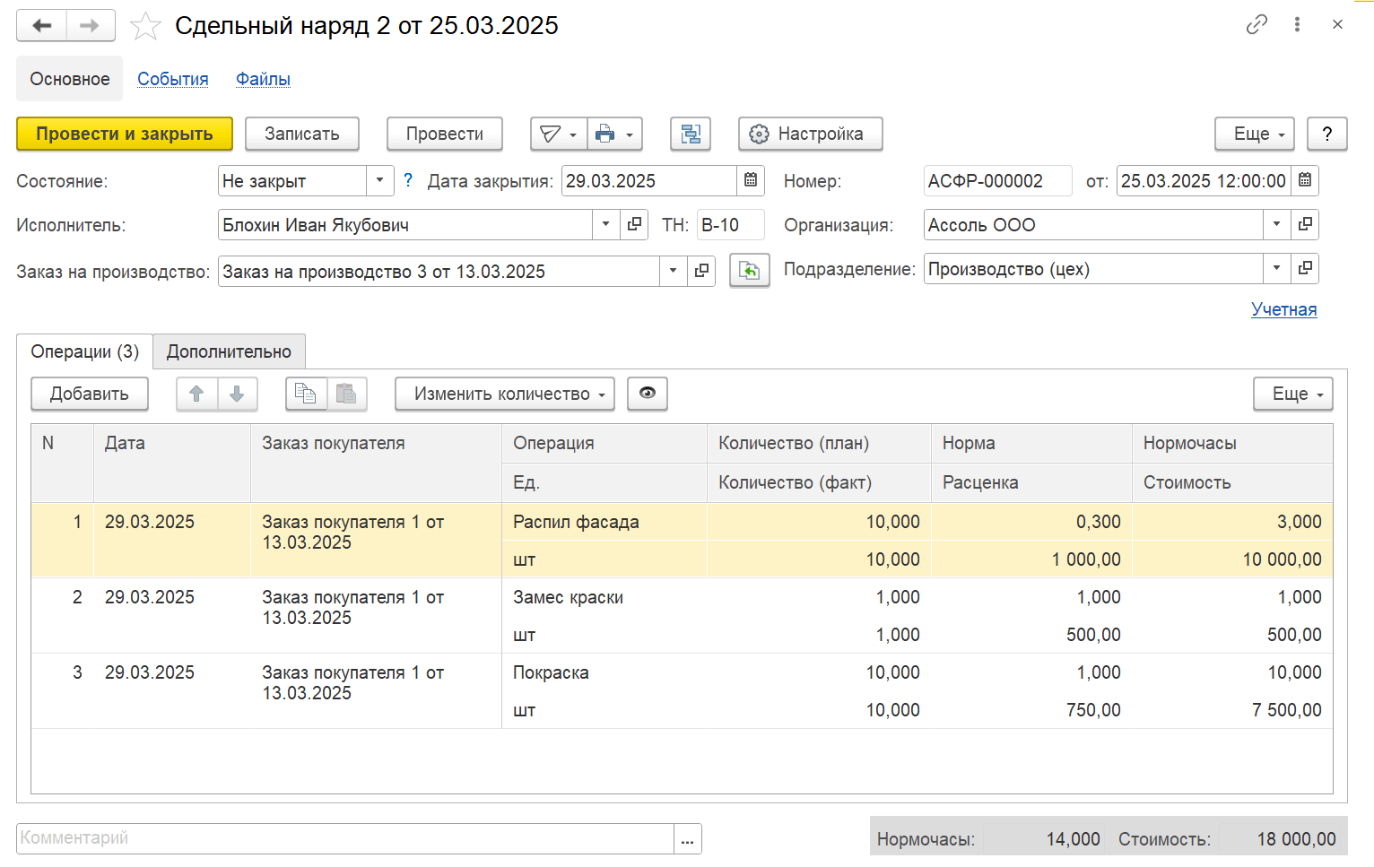 Завершим сдельный наряд. Проставляем фактическое количество операций, проверяем дату, меняем статус документа на «Закрыт» и проводим его. Такой подход обеспечивает точный учет производительности и позволяет сравнивать плановые показатели с фактическими результатами.