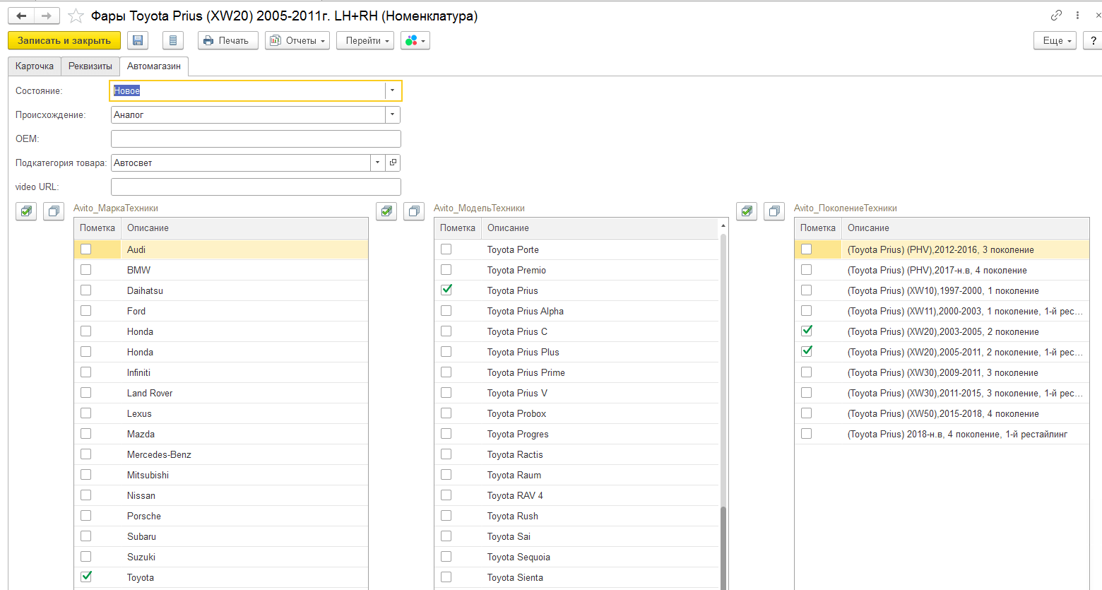 - Добавили дополнительные структуры хранения информации про применяемость автозапчасти. Справочники. «Марка», «Модель», «Модификация» зависимые друг от друга (правила каскада): Нельзя выбрать модель невыбранной марки и модификацию невыбранной модели. Также храним иную информацию по запчасти в карточке товара.
