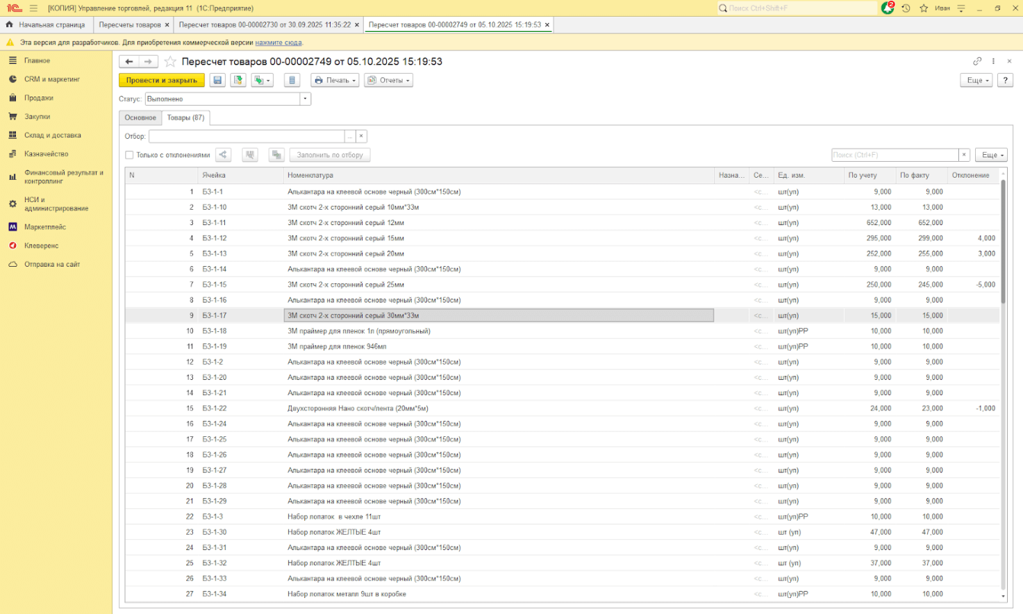 В ходе разработки возникали проблемы с некорректными данными: например, при проведении документов пересчета запросы на сайт шли без контроля изменений, что заставляло персонал зря проверять ячейки.