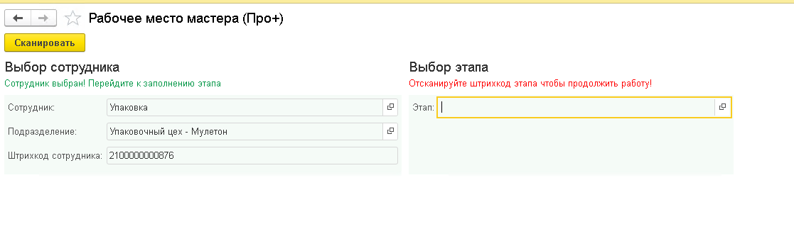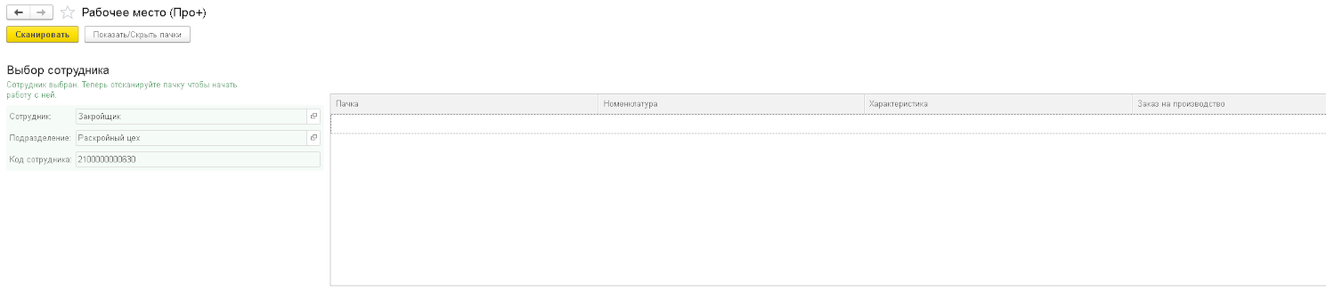 На этапе фиксации штрихкодов пачек продукции из маршрутного листа фиксируется выпуск полуфабриката и сдельный наряд сотрудника. Благодаря этому автоматически создаются документы и рассчитывается заработанная плата.