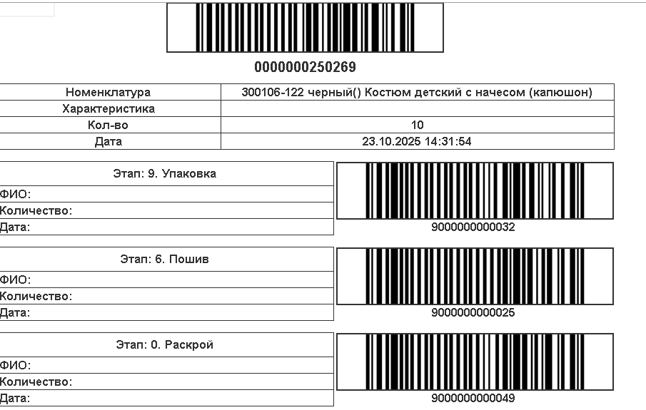 В рамках проекта создали отдельное рабочее место сотрудника и запустили в режиме «Киоск». Пользователь сканирует свой штрихкод сотрудника для идентификации и далее — штрихкод маршрутного листа. При этом в зависимости от настроек доступна автоматическая печать штрихкодов этикеток и вшивных бирок в зависимости от этапа и количества в маршрутном листе.