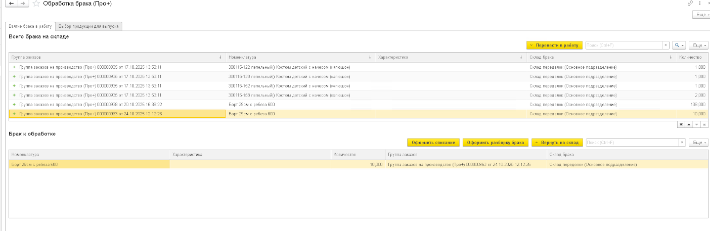 - оформить списание выбранного брака — автоматически создается документ списания;