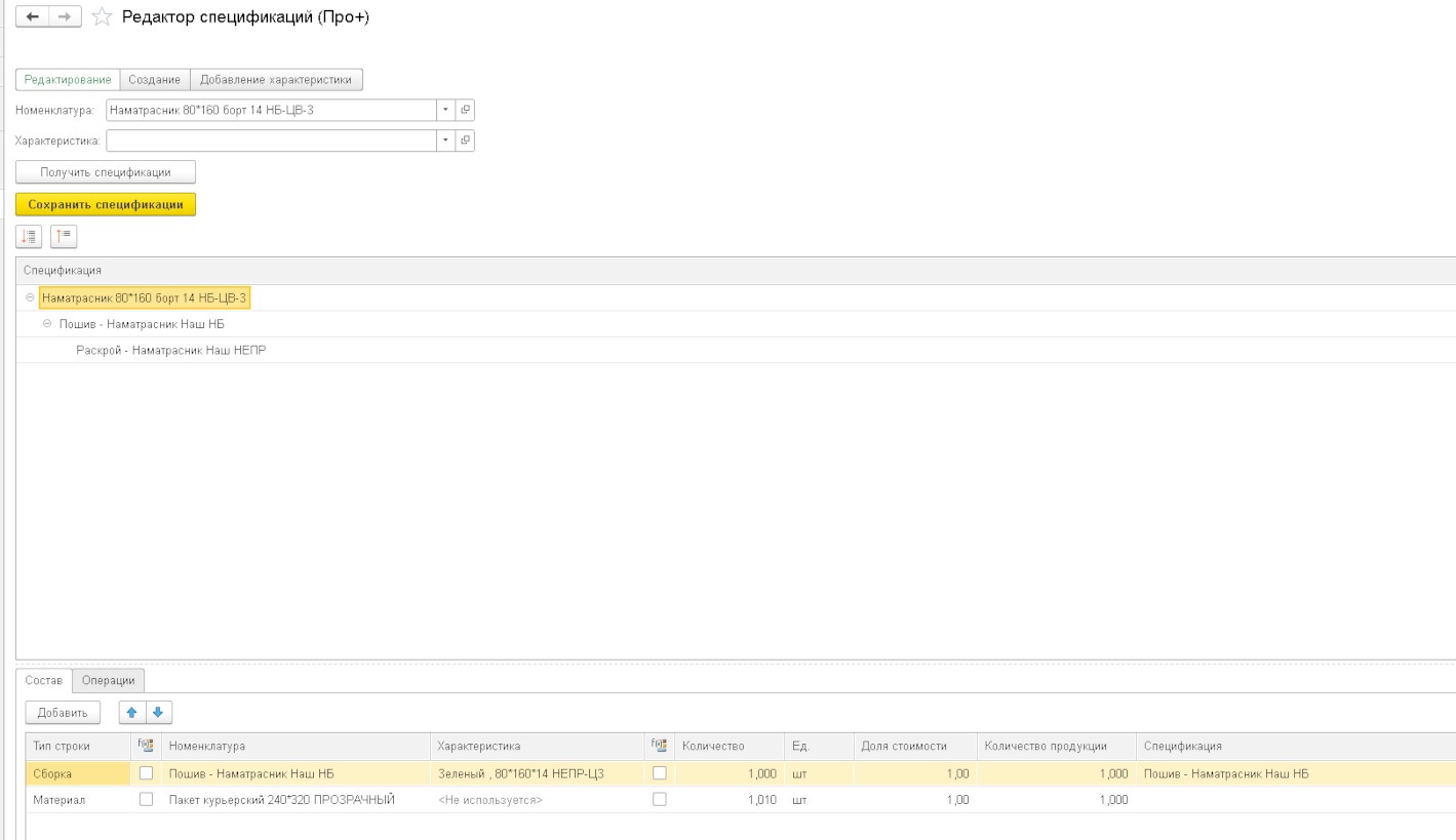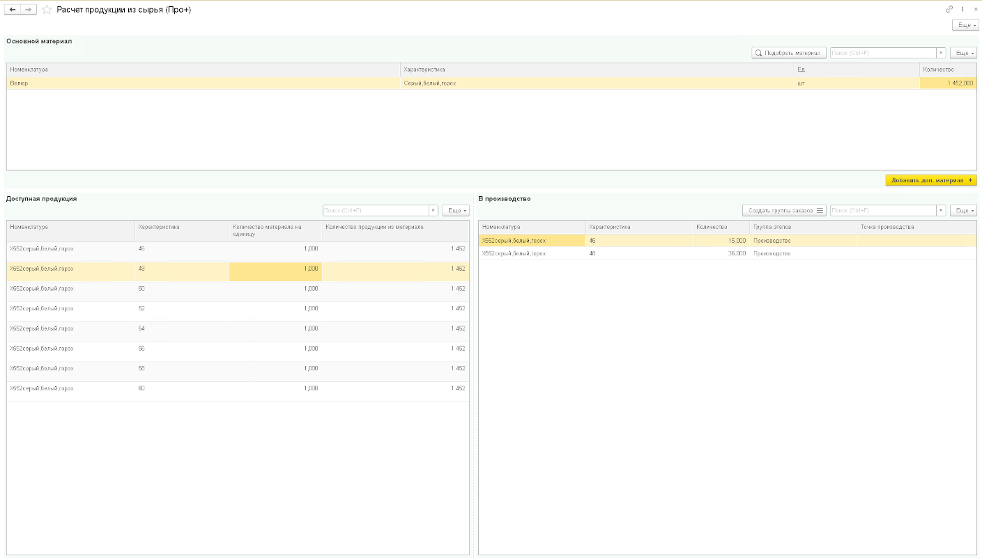 Благодаря этому инструменту мастеру достаточно выбрать сырье, из которого будет производиться готовая продукция, и на основании спецификаций «подтянутся» позиции номенклатуры с автоматическим расчетом количества и автоматическим созданием документа «Группа заказов на производство».