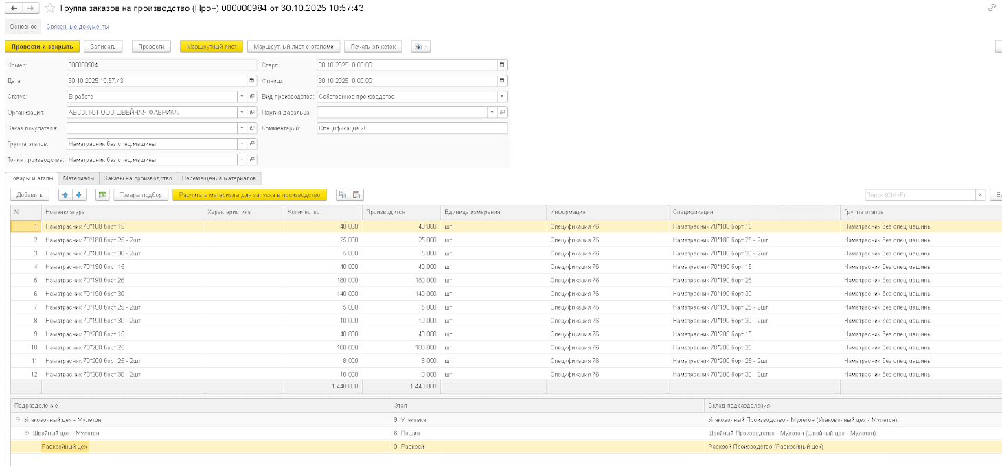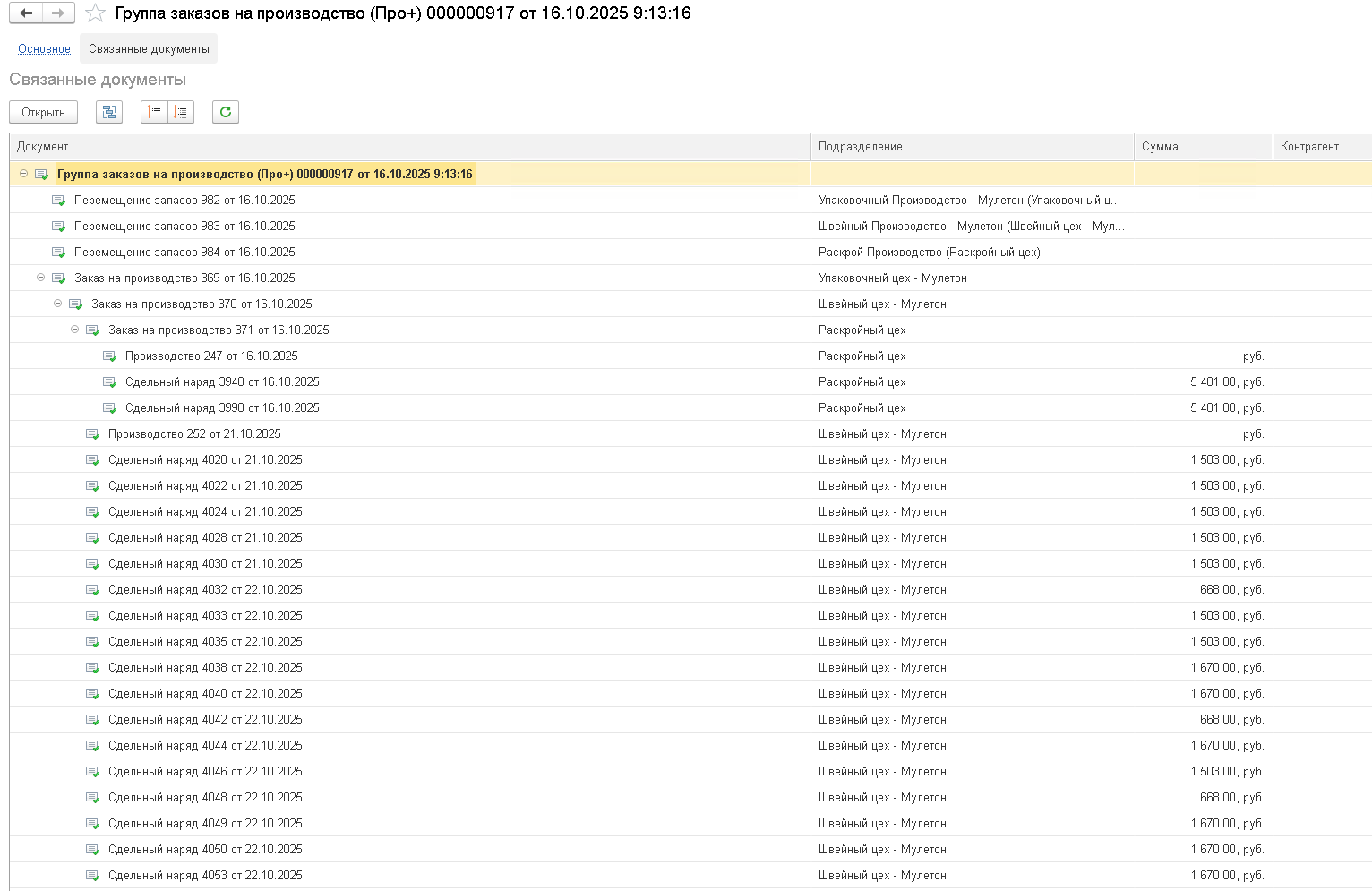 Ввели документ «Группа заказов на производство». Он аккумулирует документы планирования — «Заказы на производство», автоматически рассчитывает необходимые для выпуска готовой продукции операции и сырье.