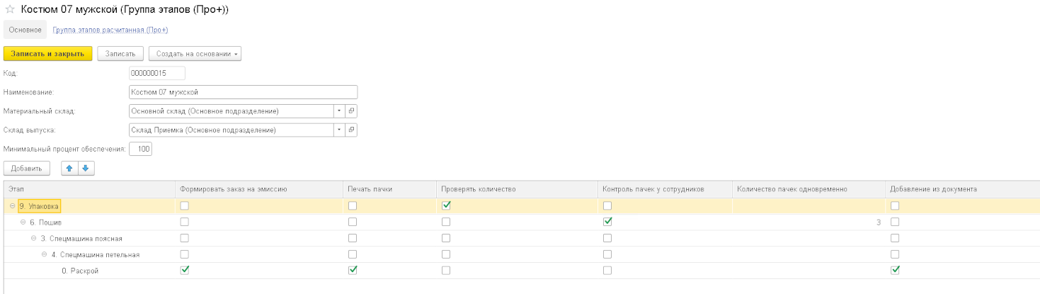 Группа этапов позволяет настроить логику движения сырья и материалов до выпуска готовой продукции. При этом доступны возможности фиксации создания заказа на эмиссию в зависимости от этапа производства, использования маршрутных листов, проверки количества пачек полуфабриката у каждого из сотрудников.