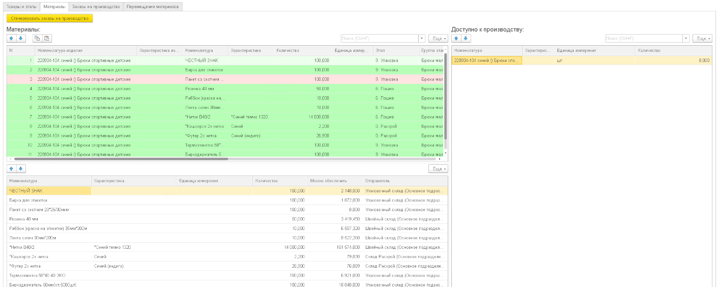 При создании группы заказов на производство система по параметрическим спецификациям выполняет автоматический расчет всех операций и материалов (сырья и полуфабрикатов). В случае нехватки — модуль подсвечивает строки с рекомендациями для обеспечения необходимого количества.