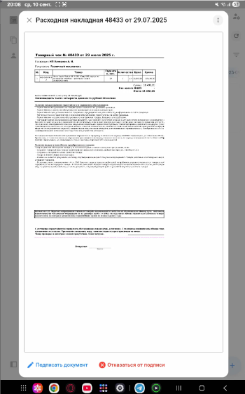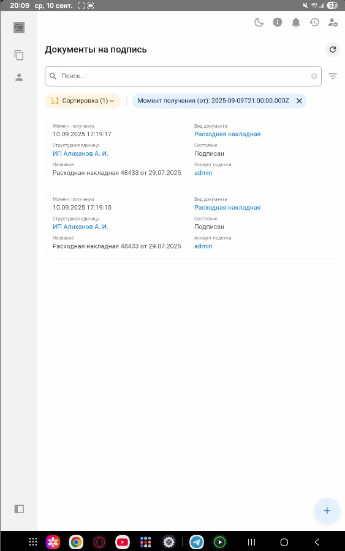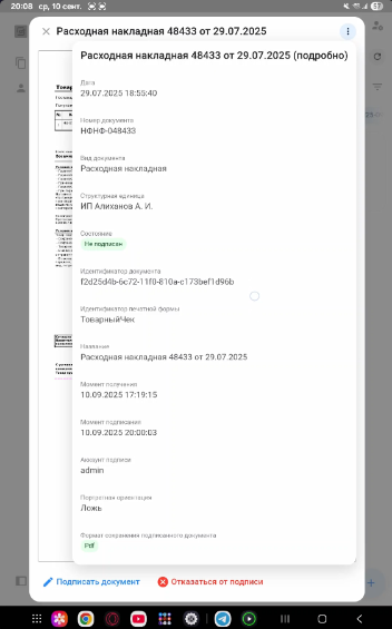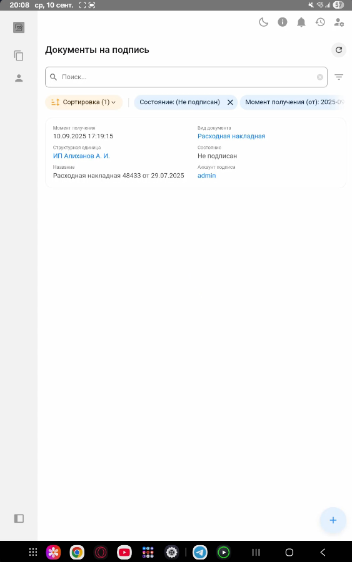 - На планшете, в приложении «Подпись» появляется новая строка с полными реквизитами документа из 1С — номер и дата документа, покупатель и иная информация.