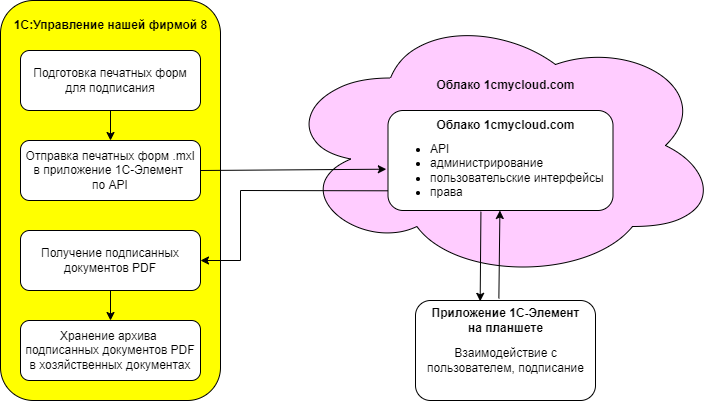 - В 1С компании установлено расширение, которое связано по API с приложением 1С:Элемент в облаке 1cmycloud.com;