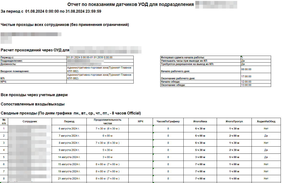- Отчет по показаниям датчиков. Реализовано заполнение табеля по данным СКУД КОДОС с вкладкой «Промежуточные результаты» для прозрачной расшифровки.