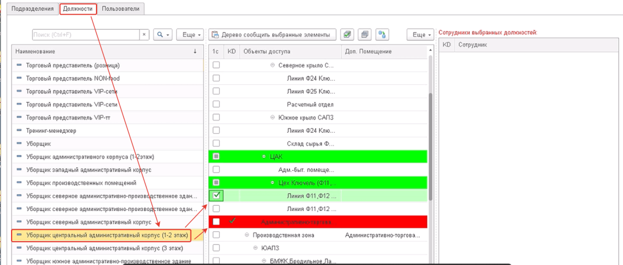 - Акцентирование прав доступа. Для удобства редактирования производим акцентирование на «забираемых» и «выдаваемых» помещениях доступа. При назначении доступа на внутреннее помещение автоматически выдаем (при отсутствии доступа ранее) на все внешние помещения, через которые нужно пройти, для того чтобы попасть в требуемое помещение.