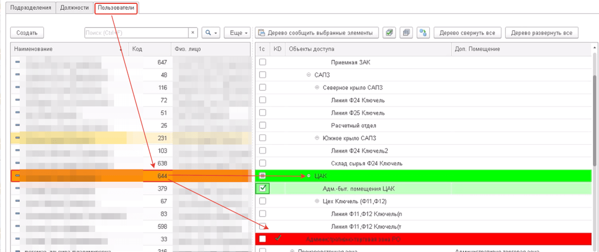 - Перед выгрузкой 1С «видит», чего нет в КОДОС, например группы, зоны или типа клиента, и создает недостающее корректно, а разницы помечает цветом. Нет ручных «костылей» в СКУД и неожиданных отказов на проходной.