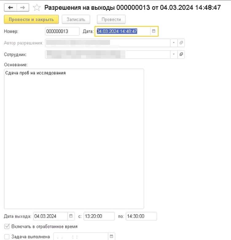 - Разрешение на выходы. Для отражения выходов из контура организации в рабочее время создан документ «Разрешение на выходы». В нем отражается информация о том, куда и зачем выходит сотрудник и включать ли этот интервал в рабочее время или нет. Документ могут составлять лишь руководители подразделений либо вышестоящих подразделений. Обязательной является отметка выполнения задачи. Если задача не выполнена, то временной интервал не будет включен в отработанное время сотрудника.