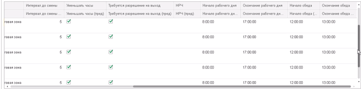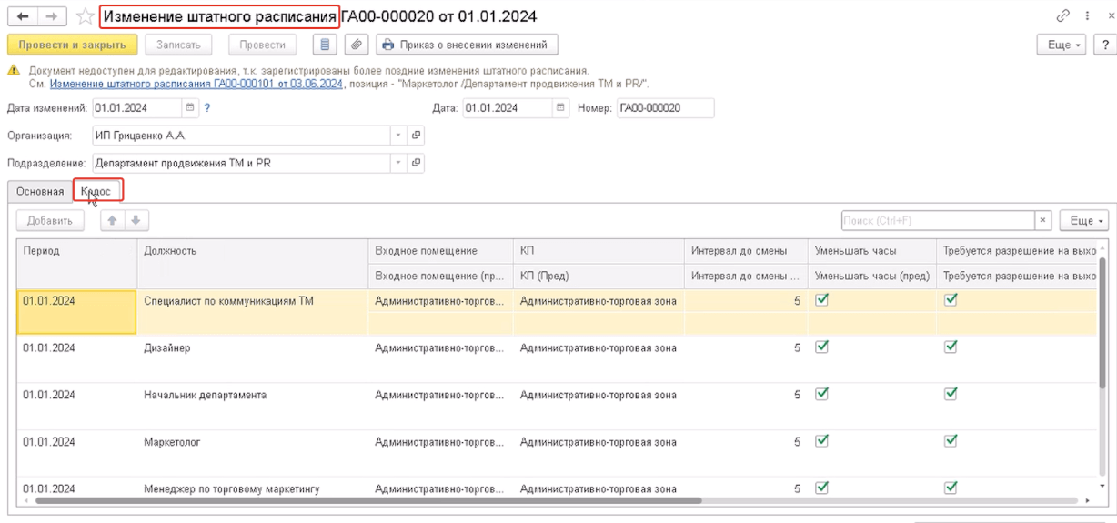 - Изменение штатного расписания. Расширен функционал документа «Изменение штатного расписания». Для каждой должности задаются время начала и окончания рабочего дня, начала и окончания обеда, допустимые точки входа на территорию, помещение, с которого начинается временной отсчет рабочего дня, за какое время до начала рабочего дня сотрудник должен быть на территории и прочие параметры.