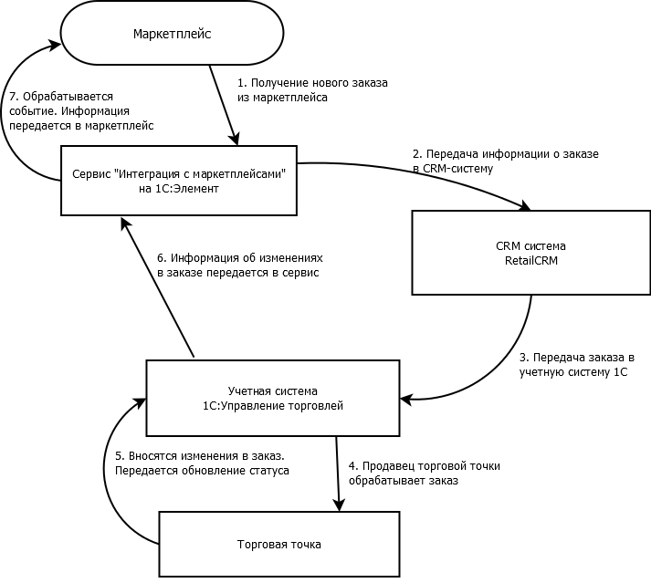 Альтернативный вариант интеграции с маркетплейсами через модули в платформе 1С также не подходил, поскольку информация о заказах должна была попадать изначально в RetailCRM, при этом ряд маркетплейсов работают по модели webhook, при которой маркетплейс отправляет интегрированной системе сообщение. При этом необходимо было учитывать вопросы безопасности, изоляции, скорости передачи информации и затраты на поддержку и сопровождение.