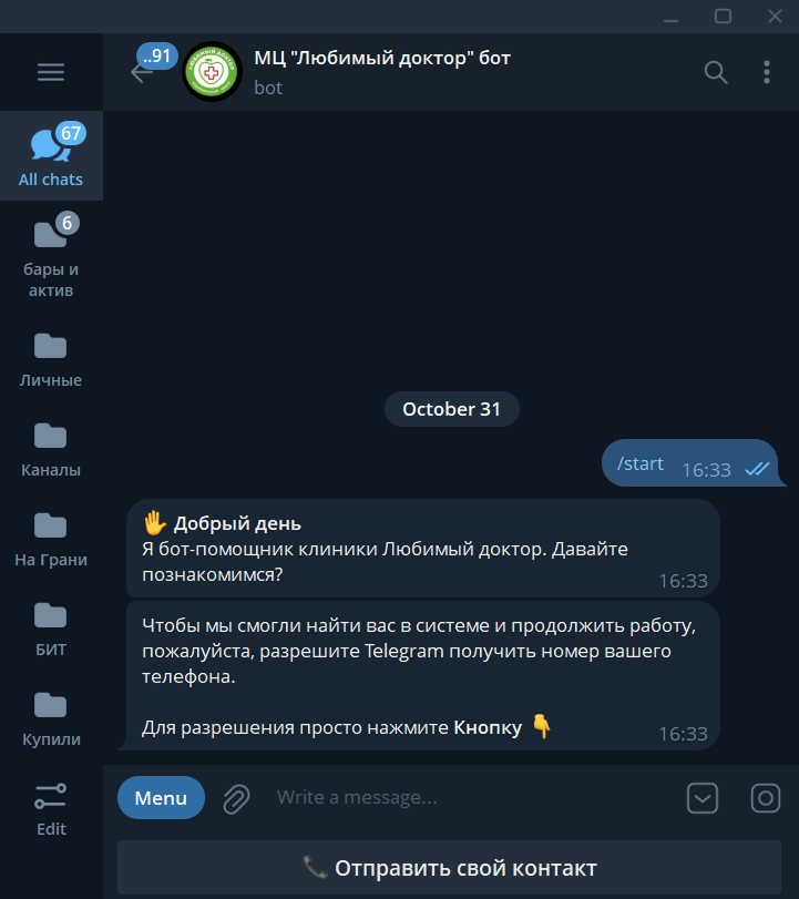 Преимуществом телеграм-бота является возможность просмотреть историю посещений врача, вести учет средств бонусной программы и сертификатов в личном кабинете пациента.