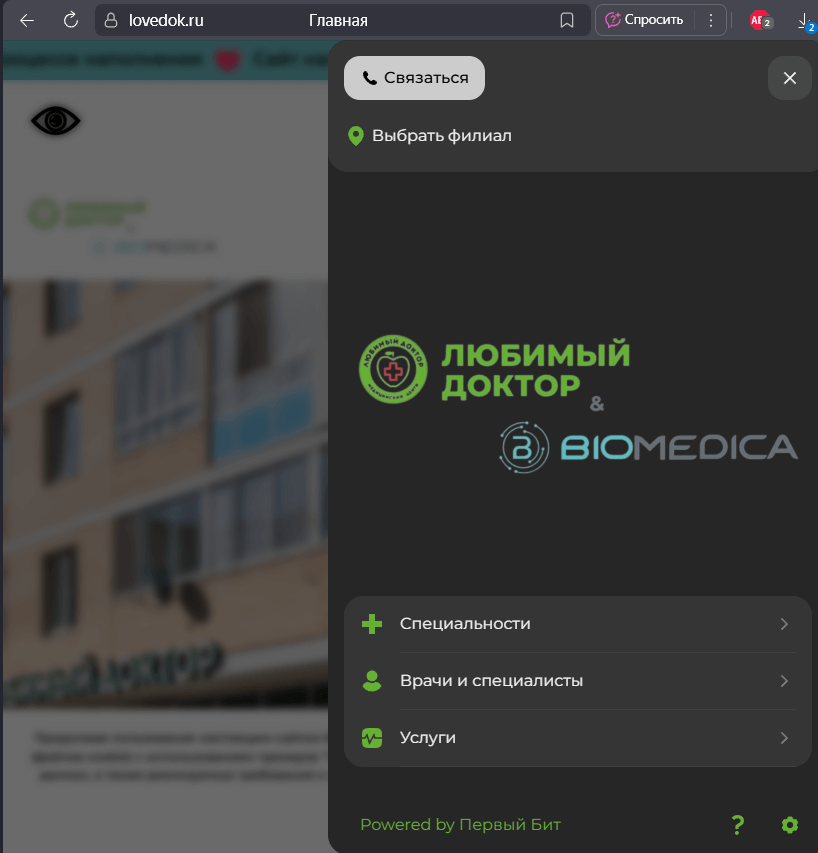 Для новых пациентов клиники, которые чаще находят ее в сети, реализован виджет на сайте. Его функционал аналогичен боту и позволяет записываться на прием в конкретные филиалы к необходимым специалистам.