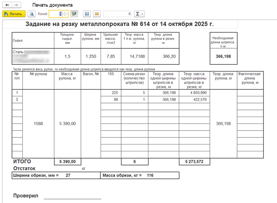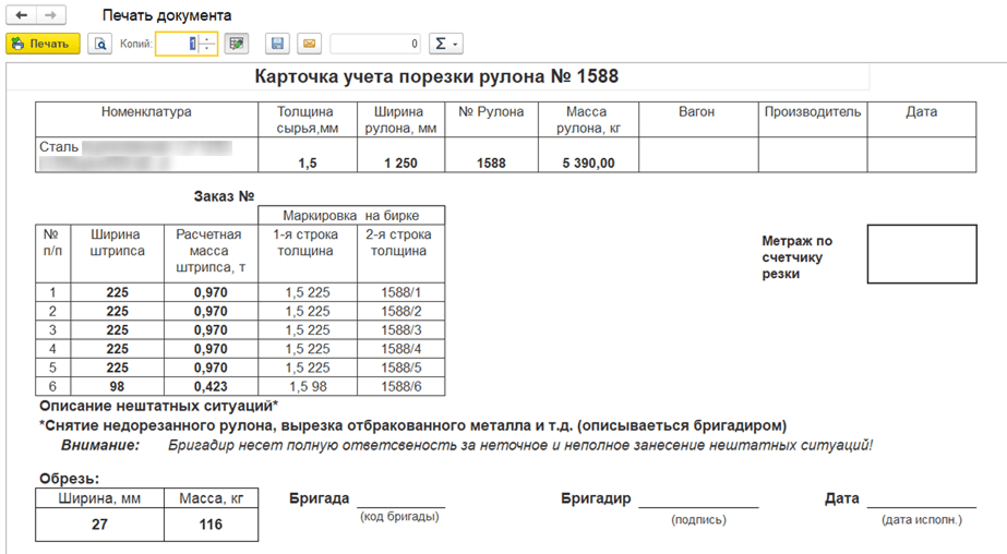 - 2. «Карточка учета порезки рулона». Этот документ передается на участок и содержит детализированные данные о сырье и выпущенных штрипсах.