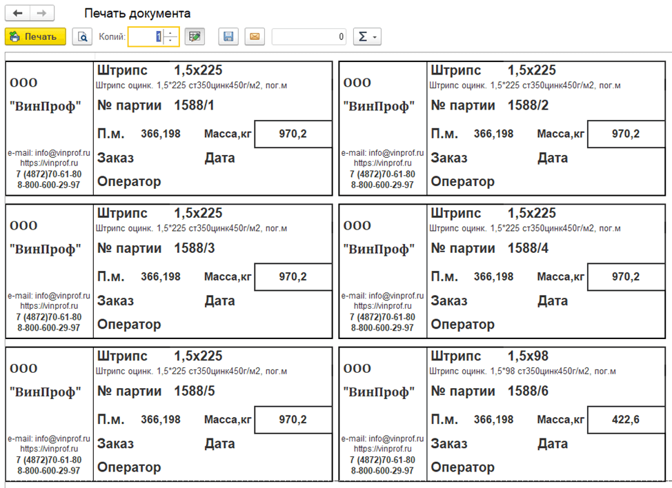 - 3. Этикетки для партий продукции и остатков сырья. С параметрами, массой и длиной. Если рулон режется не полностью, программа автоматически формирует новую этикетку для остатка.