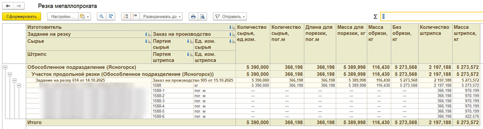- 4. «Резка металлопроката». Специализированный отчет для контроля, где показатели выводятся одновременно в килограммах и в погонных метрах.