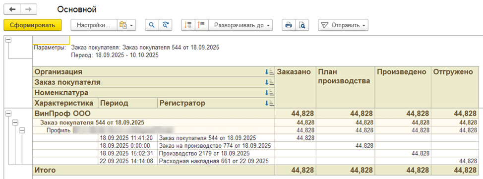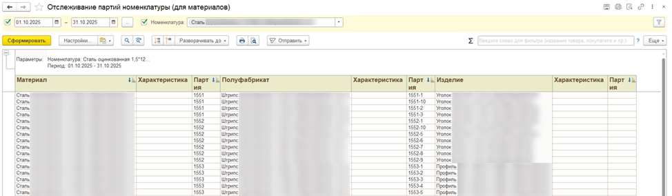 Отчет «Отслеживание партий номенклатуры» связывает продукцию с исходным сырьем, позволяя проследить путь материала от поступления до выпуска.
