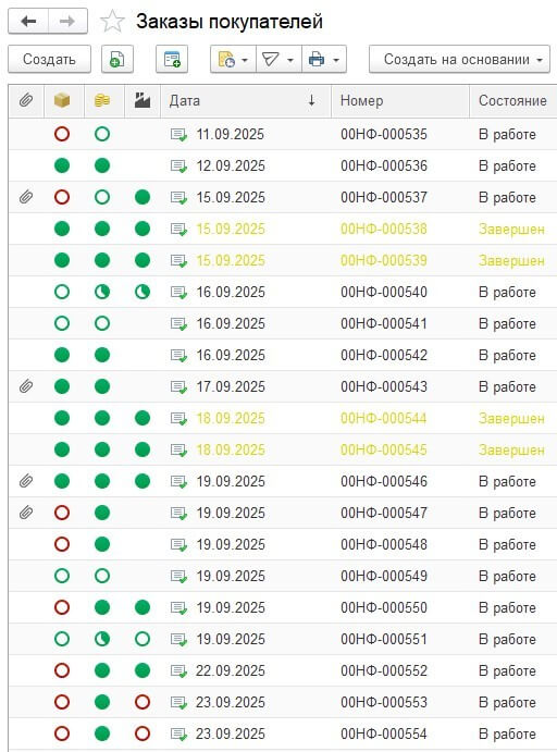 - Контроль статусов заказов прямо в списке. В список заказов покупателя добавлена колонка со статусом производства. Теперь менеджеры сразу видят, на каком этапе находится каждый заказ, без необходимости открывать отчеты и делать выборки.
