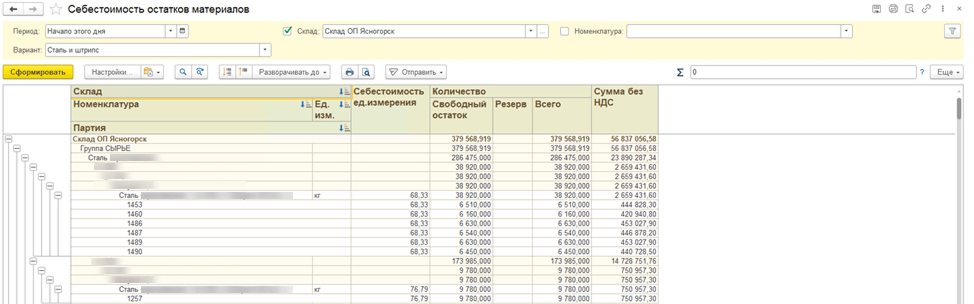 Отчет «Себестоимость остатков материалов» объединяет ключевые показатели по основным материалам (рулонная сталь, штрипсы) в одном окне, помогая быстро выявлять отклонения и контролировать производственные затраты.
