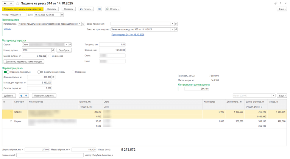 Для этого мы разработали документ «Задание на резку», который стал рабочим местом мастера: теперь весь процесс — от подбора рулона до оформления производственных документов — выполняется в одном окне, автоматически.
