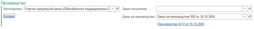 Удобство и контроль — на каждом шаге. В разделе «Производство» пользователь выбирает подразделение, и система автоматически подставляет склады из настроек. При необходимости их можно поменять вручную. Все ключевые связи («Заказ покупателя», «Заказ на производство», «Изготовитель») видны прямо в документе.