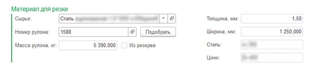 При выборе сырья программа автоматически подставляет его характеристики: толщину, ширину, марку стали, тип покрытия. Если свойства не совпадают с выбранной продукцией, появляется предупреждение.