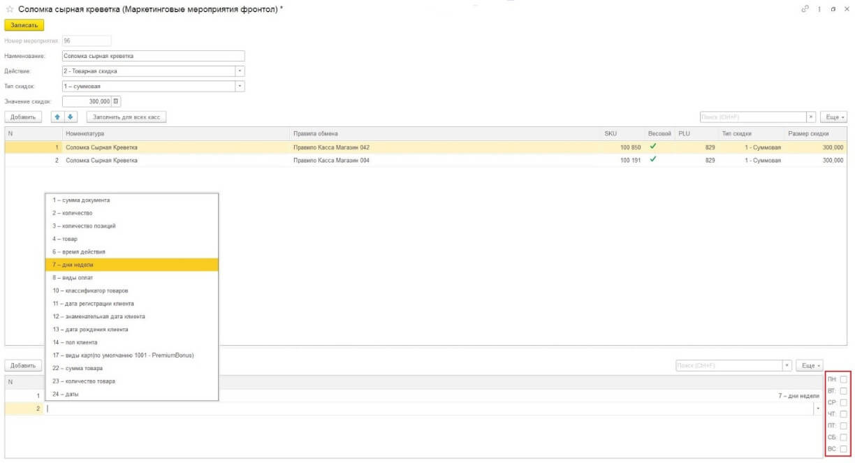 4. Вид условия мероприятия: настройка дополнительных условий для применения той или иной скидки/акции. Например, можно добавить условие «дни недели». В таком случае справа появляется новое окно с возможностью выбора некоторых дней недели. Если необходимо установить действие акции в будние дни, то соответственно отмечаем флажками аббревиатур всех дней недели от ПН до ПТ. Также можно установить применение акции, например, на дату рождения клиента, которая будет автоматически считываться при предъявлении карты лояльности.