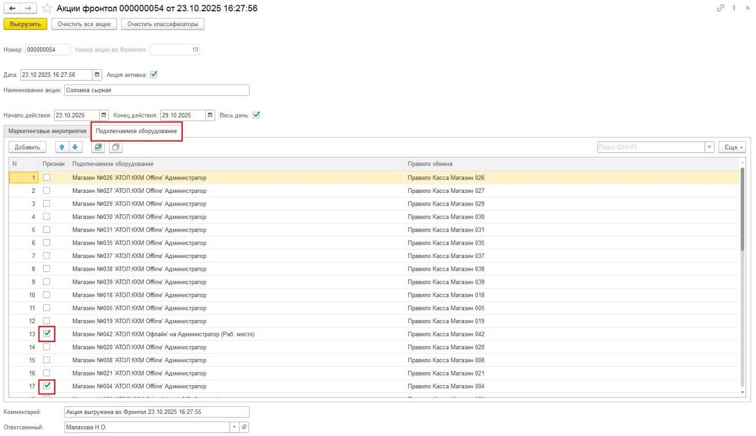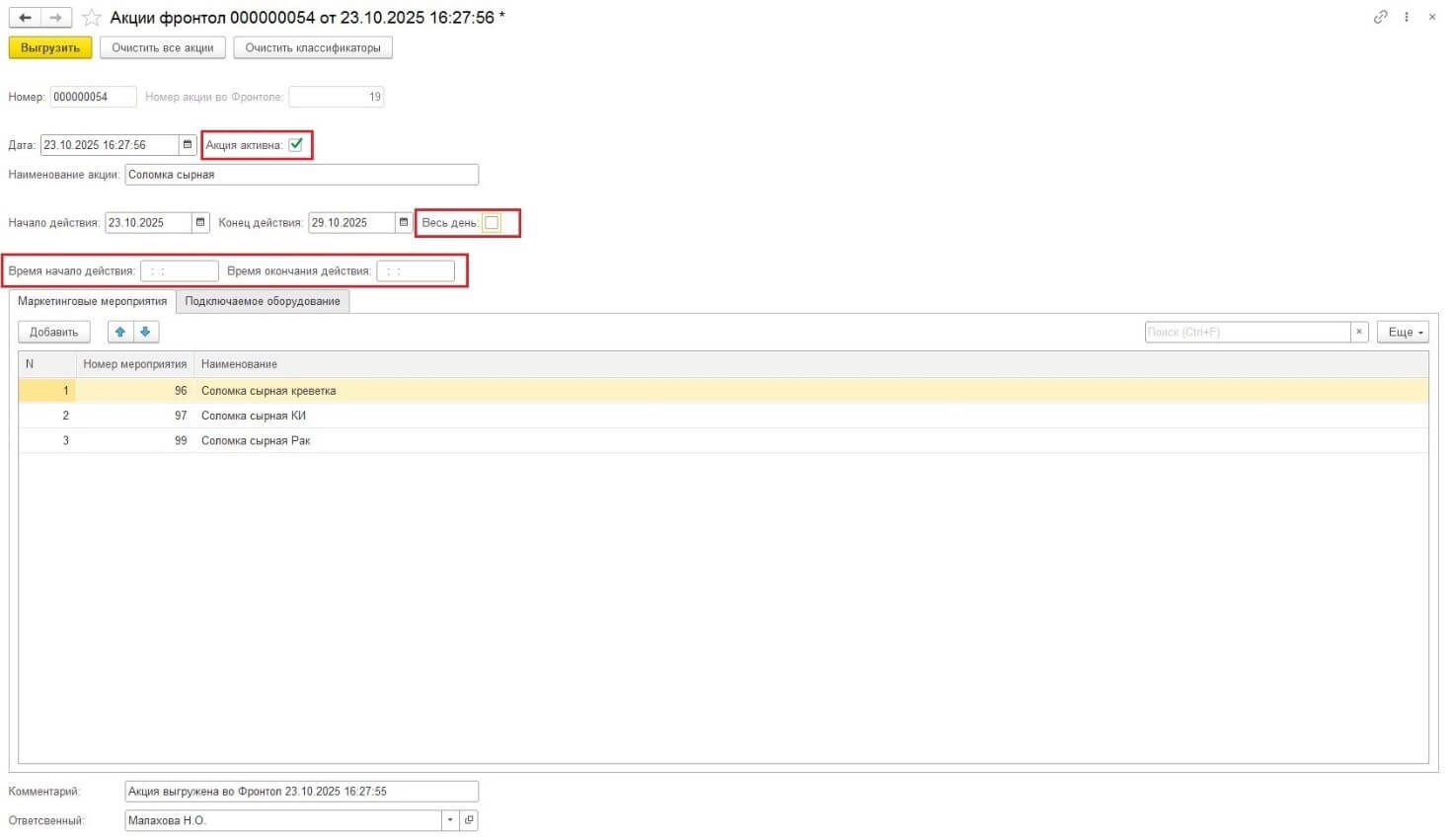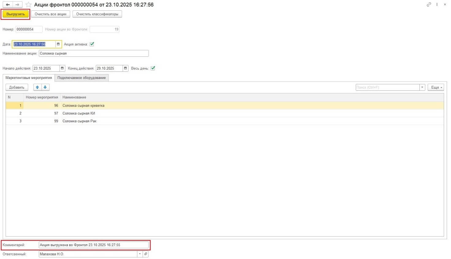 После завершения всех операций по настройкам маркетинговых мероприятий и выбора оборудования необходимо выгрузить файл акций для дальнейшей его загрузки в «Фронтол». Для этого внутри самого документа была добавлена кнопка «Выгрузить». После того как пользователь ей воспользовался, программа автоматически в комментарии документа фиксирует факт и время его выгрузки. В случае, если выгрузка повторится, программа изменит комментарий и зафиксирует в нем дату последних действий (выгрузки).