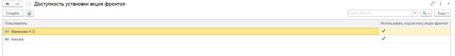 Доступ к данной подсистеме имеет только тот пользователь, по которому в дописанном регистре сведений «Доступность установки акция фронтол» зафиксирован признак ее непосредственного использования.