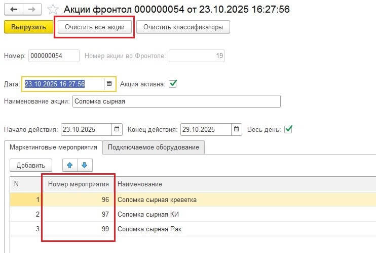 Нередко возникают обстоятельства, требующие изменения сроков проведения акции либо ее полного досрочного завершения. В подобной ситуации пользователю необходимо внести соответствующие правки, уменьшив или увеличив продолжительность акции, либо и вовсе отменить ее активность путем снятия соответствующего признака. После чего повторно провести выгрузку файла из 1С для его последующей загрузки и применения в «Фронтол».