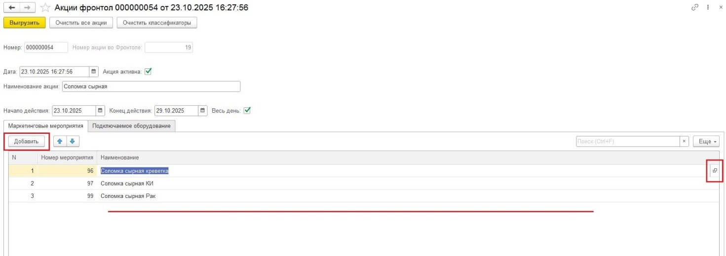 Реализация проекта началась с добавления в 1С новой подсистемы «Маркетинговые акции фронтол», включающую в себя справочник «Маркетинговые мероприятия фронтол» и непосредственно журнал документов «Акции фронтол».