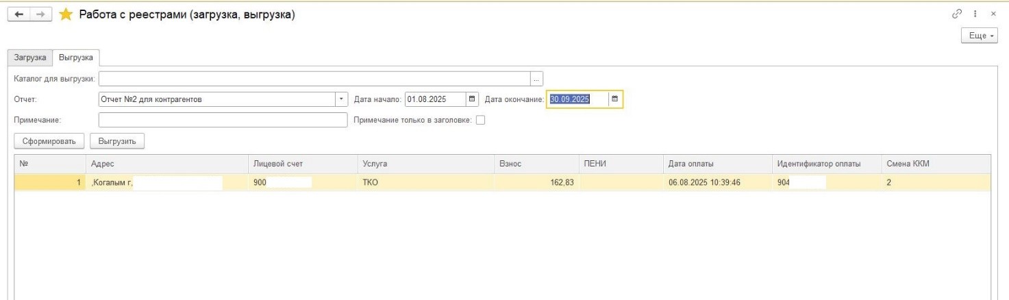 Особых сложностей на этом этапе тоже не возникло, так как и у поставщиков и для ГИС ЖКХ уже были свои форматы получения данных. Для поставщиков было сделано несколько обработок по выгрузке файлов в формате .txt, а для выгрузки в ГИС ЖКХ — отдельный отчет с возможностью сохранения в Excel-файл, готовый к загрузке.