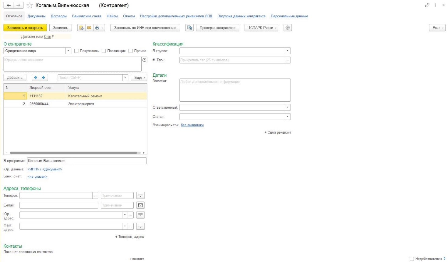 Было решено для контрагентов-потребителей сделать дополнительную табличную часть, в которой был указан список поставщиков услуг и номер лицевого счета этого абонента у каждого поставщика.