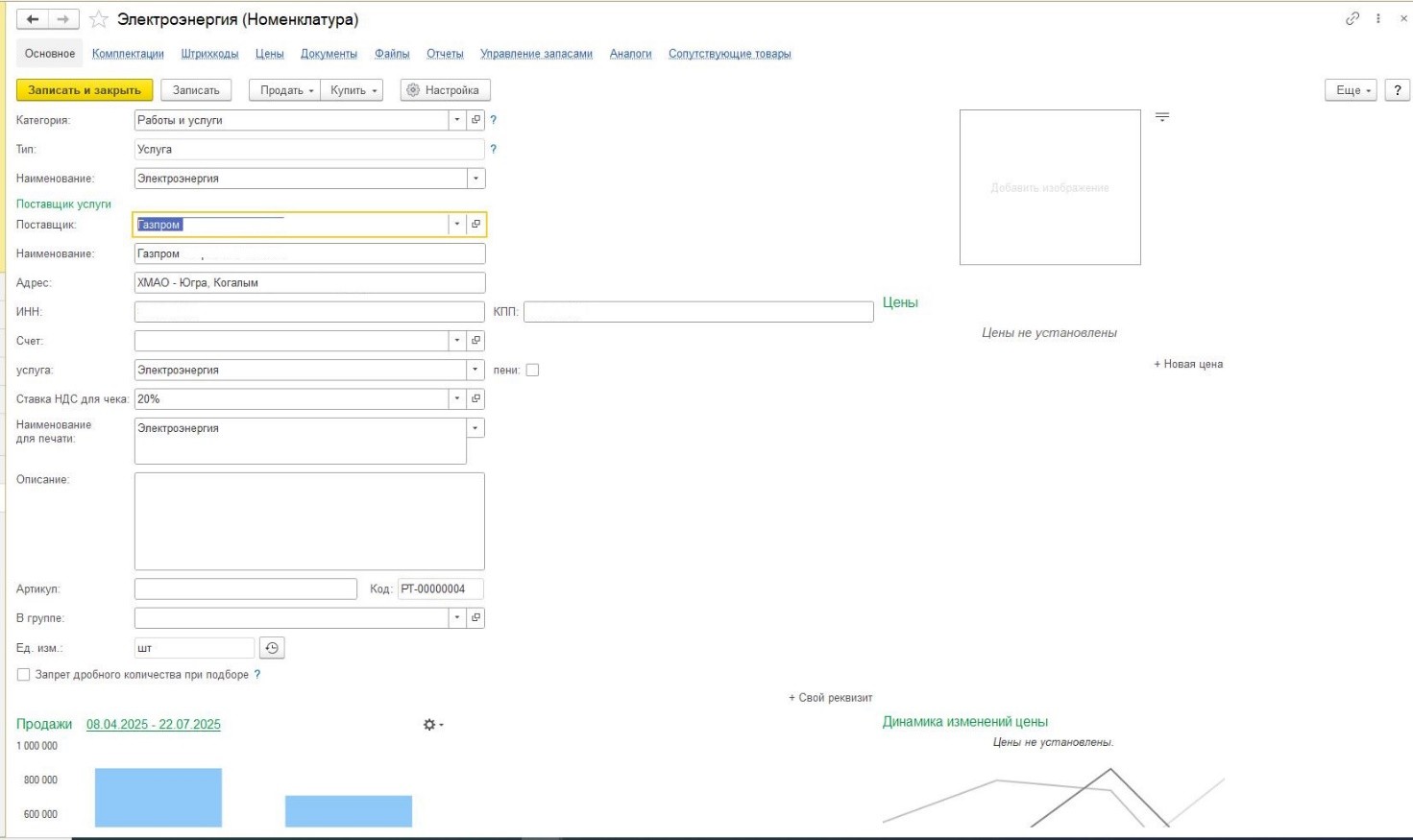 В справочник «Номенклатура» с типом «Услуга» были добавлены дополнительные поля с указанием поставщика этой услуги, его реквизитов и ставки НДС — у разных услуг разная ставка НДС.