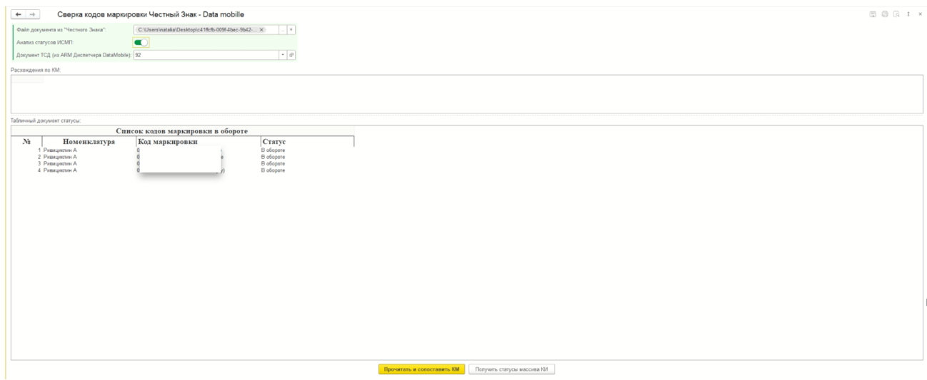 - Контроль сканирования маркировки и выявление расхождений: разработан инструмент оперативного выявления расхождений между фактическими сканами и данными из ЧЗ с детализацией по КМ.