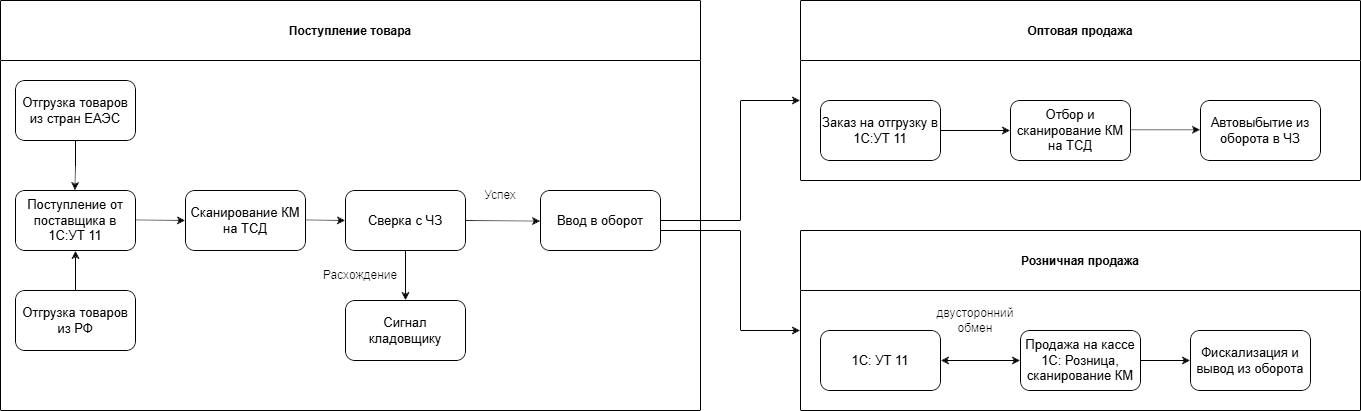 - Сквозная интеграция: реализованы механизмы обмена данными с 1С:Бухгалтерией, розничными точками, оптовыми поставщиками по схеме дистрибуции, а также с государственными системами («Честный знак», ФГИС «Меркурий»).