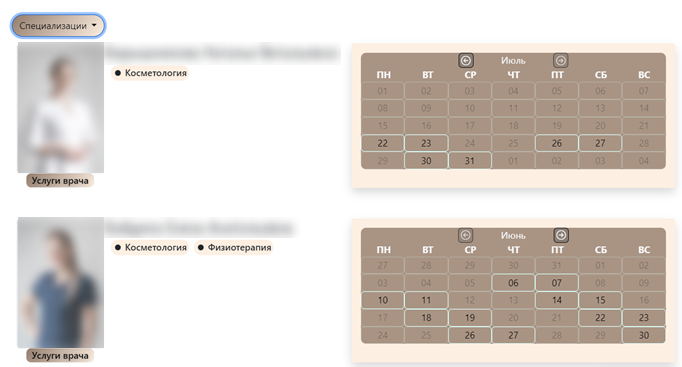 Интегрировали в систему дополнительный модуль онлайн-записи, который дает возможность реализовать на сайте форму для записи пациентов на прием с возможностью отфильтровать карточки специалистов по специализации, выбрать подходящий день и время. Указанные при заполнении формы данные автоматически синхронизируются с внутренним календарем планирования в МИС.