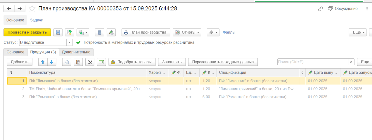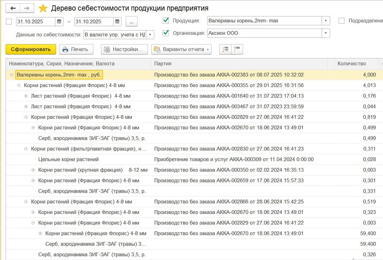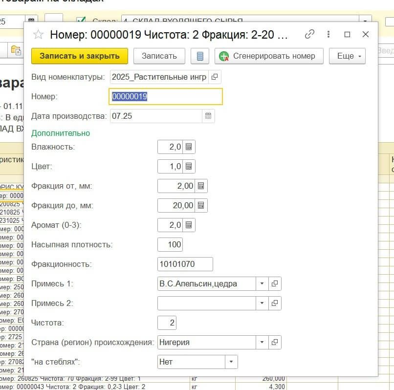 До 2025 года в программе 1С:Комплексная автоматизация 8.3 (ред. 2.5) использовались характеристики номенклатуры. Однако после детального изучения функционала системы 1С было принято решение о внедрении учета по сериям, которые хранят данные об основных параметрах каждого ингредиента и обеспечивают полную прослеживаемость продукта.