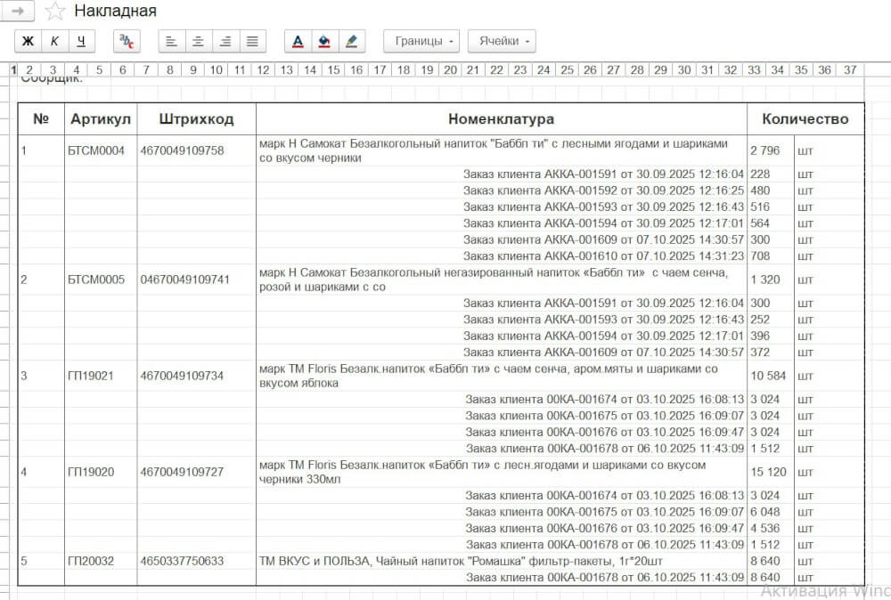 Для удобства подготовки готовой продукции к формированию заказов разработан документ «Консолидация заказов» и 3 печатные формы. Данный документ позволяет консолидировать товары по нескольким заказам одновременно и провести отбор ТМЦ с целью последующего распределения по заказам.