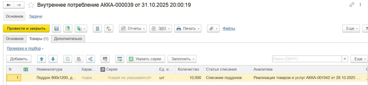 При проведении реализации товаров мы создаем внутреннее потребление с упаковочными материалами и статьей аналитики, которой и является данная реализация. Данная доработка позволяет оперативно учитывать Тару и упаковочные материалы, которые не участвуют в ресурсных