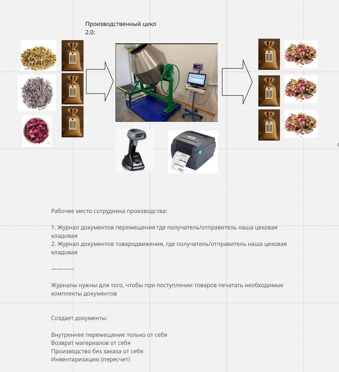 Была налажена работа с терминалами сбора данных (ТСД), обеспечивающая выполнение операций приемки и отгрузки ТМЦ, инвентаризации, а также простых производственных процессов, не требующих ресурсных спецификаций, с возможностью создания документа «Производство без заказа».