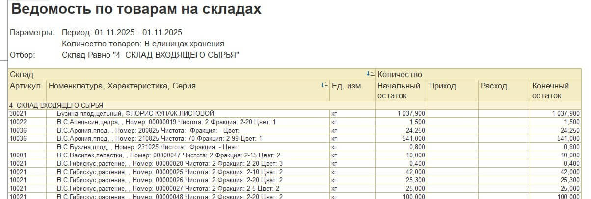 В первую очередь мы ограничили права на работу с номенклатурой, оставив такую возможность 2-м сотрудникам организации. В наименование номенклатуры вынесли лишь ключевую информацию о растительном сырье, такую как