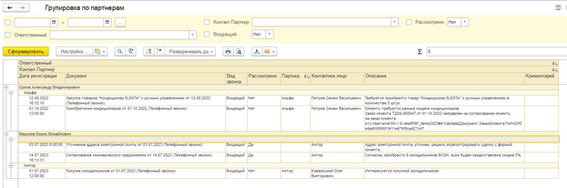 Мы внедрили систему контроля взаимодействия менеджеров с клиентами. Разработали внешний отчет, фиксирующий все события — звонки, встречи, переписку — в разрезе клиентов и менеджеров. Отчет поддерживает фильтрацию по дате, сотруднику и контрагенту.