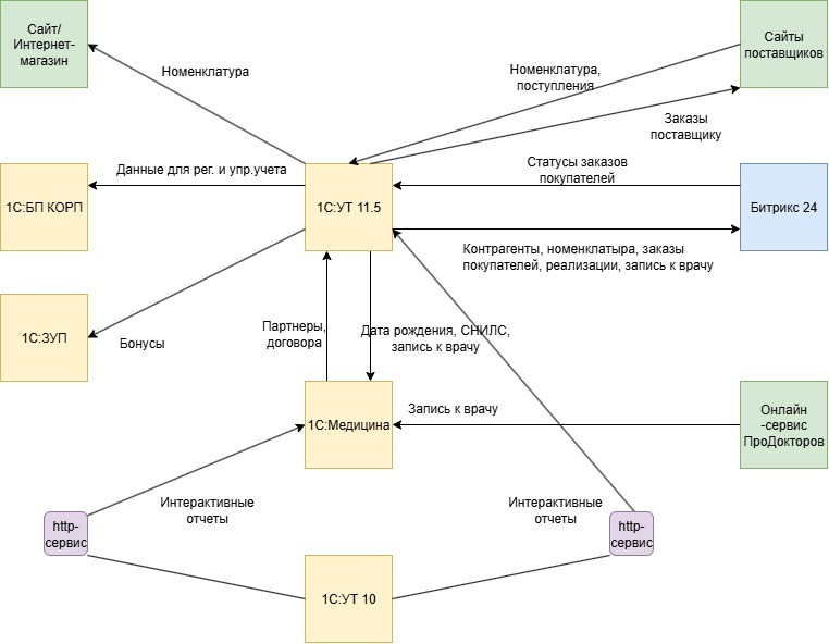 - Из «Битрикс 24» заносились данные в «1С:Управление торговлей» ред. 11.5 в части актуальных статусов заказов, и, наоборот, загружались из «1С» контрагенты, номенклатура, реализации. А из «1С:Медицина» использовалась как источник данных для CRM-системы в части информации о записях к врачу.